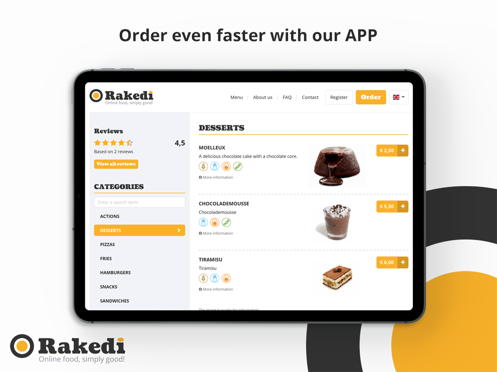 MobileWith the Rakedi APP you get a personalised mobile application that your customers can put on their smartphones and tablets immediately, available in the iOS App Store and Google Play store.