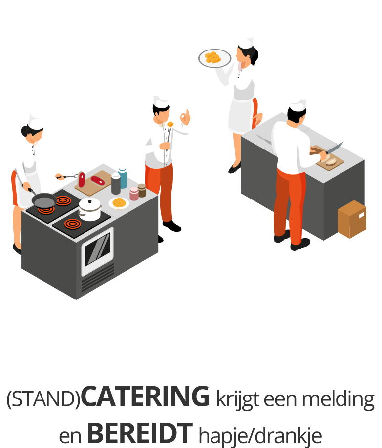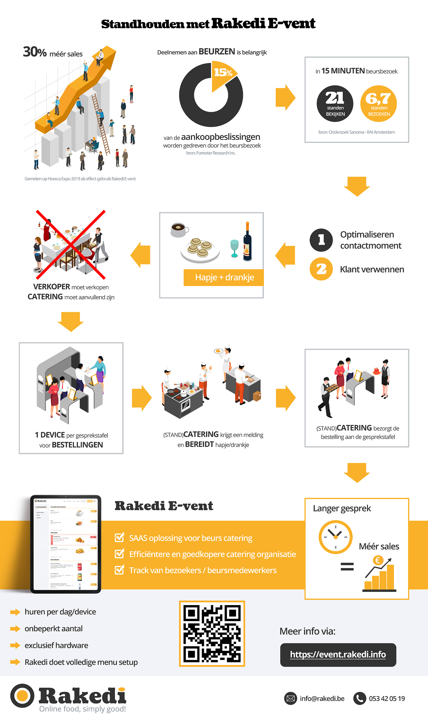 De bekende Rakedi online food ordering applicatie werd aangepast om van dienst te zijn op beurzen en evenementen waar de bezoekers een drankje en/of hapje kunnen verkrijgen. Verkopers kunnen nu meer tijd aan de bezoeker besteden omdat de catering van beurs of evenement de orders doorkrijgt via de smartphone of iPad van de verkoper.